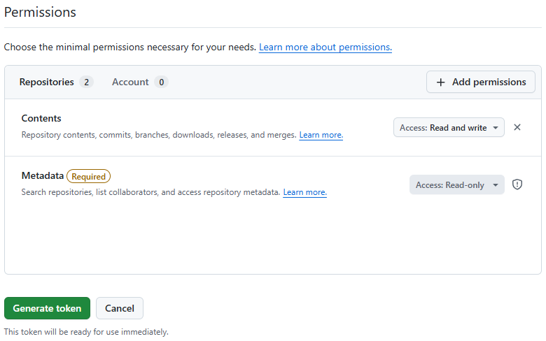 Cloud - Create a private, empty, repository on GitHub. You will also need a Fine-grained token with Contents (Read and write) permissions.